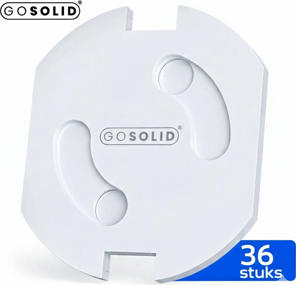 Pack of 36 GO SOLID! outlet safety covers in white. Easy push-in installation blocks access to live contacts and reduces risk of electric shock. Durable, child-resistant material with a low-profile design to blend into home décor. Fits standard sockets — ideal for babies and toddlers.