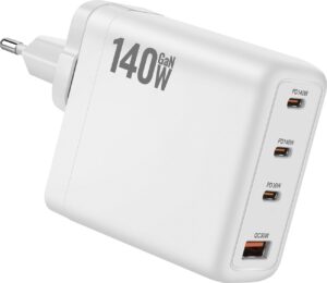 Compact high-power GO SOLID! charger 140W with 4 ports (3× USB-C, 1× USB-A). Fast charging with Power Delivery and Quick Charge compatibility for phones, tablets and laptops. Intelligent power distribution lets you charge multiple devices simultaneously at optimal speed. Safety protections for over-current, over-voltage and short-circuit ensure secure charging. Portable, lightweight design ideal for home, office and travel. Compatible with Apple, Samsung, Google, Huawei, Xiaomi, OnePlus, Dell, HP and Lenovo.