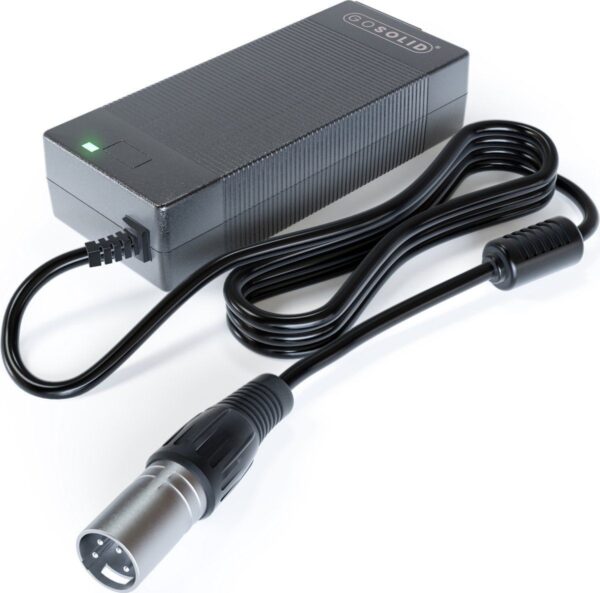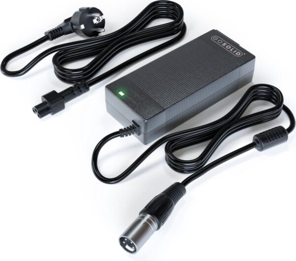 GO SOLID! Replacement charger for the B'twin Rockrider ST100 electric bike with XRL4 plug. Compact and durable design for safe, reliable charging. Compatible with B'twin. Features: precise XRL4 connector, solid construction and easy handling — ideal as a replacement or spare charger for your e-bike. Follow the vehicle manufacturer's instructions before use.