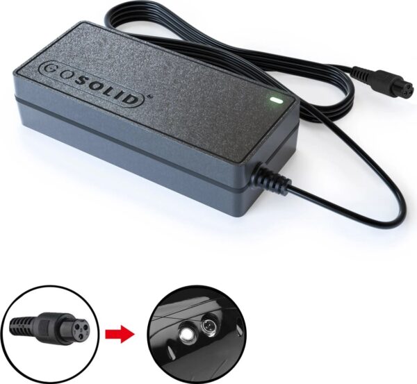 Replacement GO SOLID! charger for Denver BDO-6501 hoverboard. Output: 42V 2A. Compact, durable design with LED indicator and a sturdy charging cable—ideal as a spare or replacement charger. Easy plug-in connection for quick charging. Compatible with Denver.